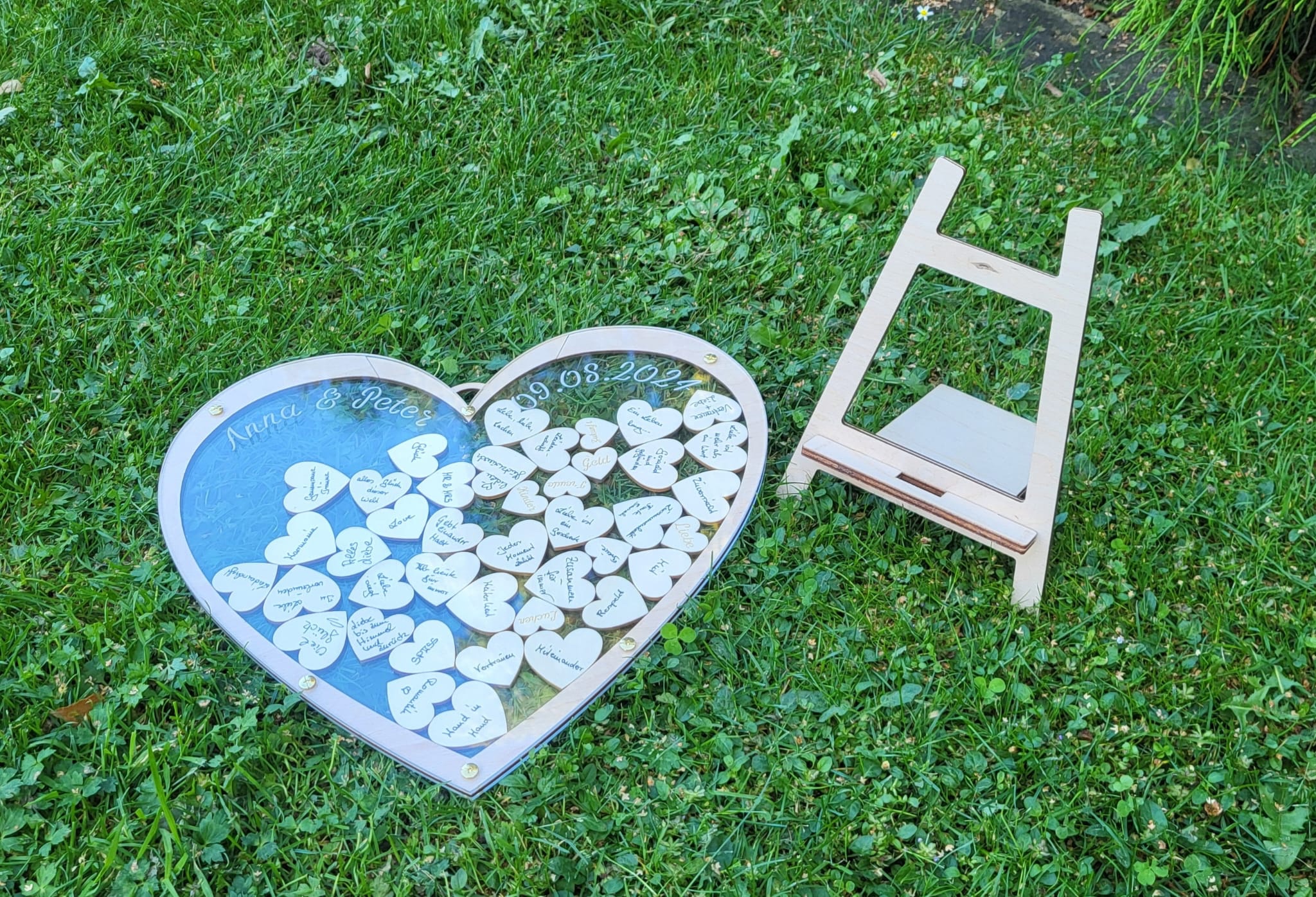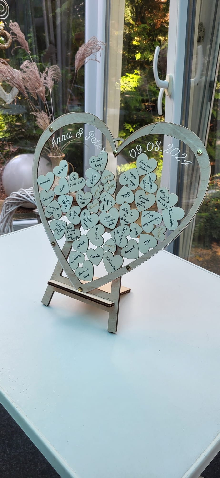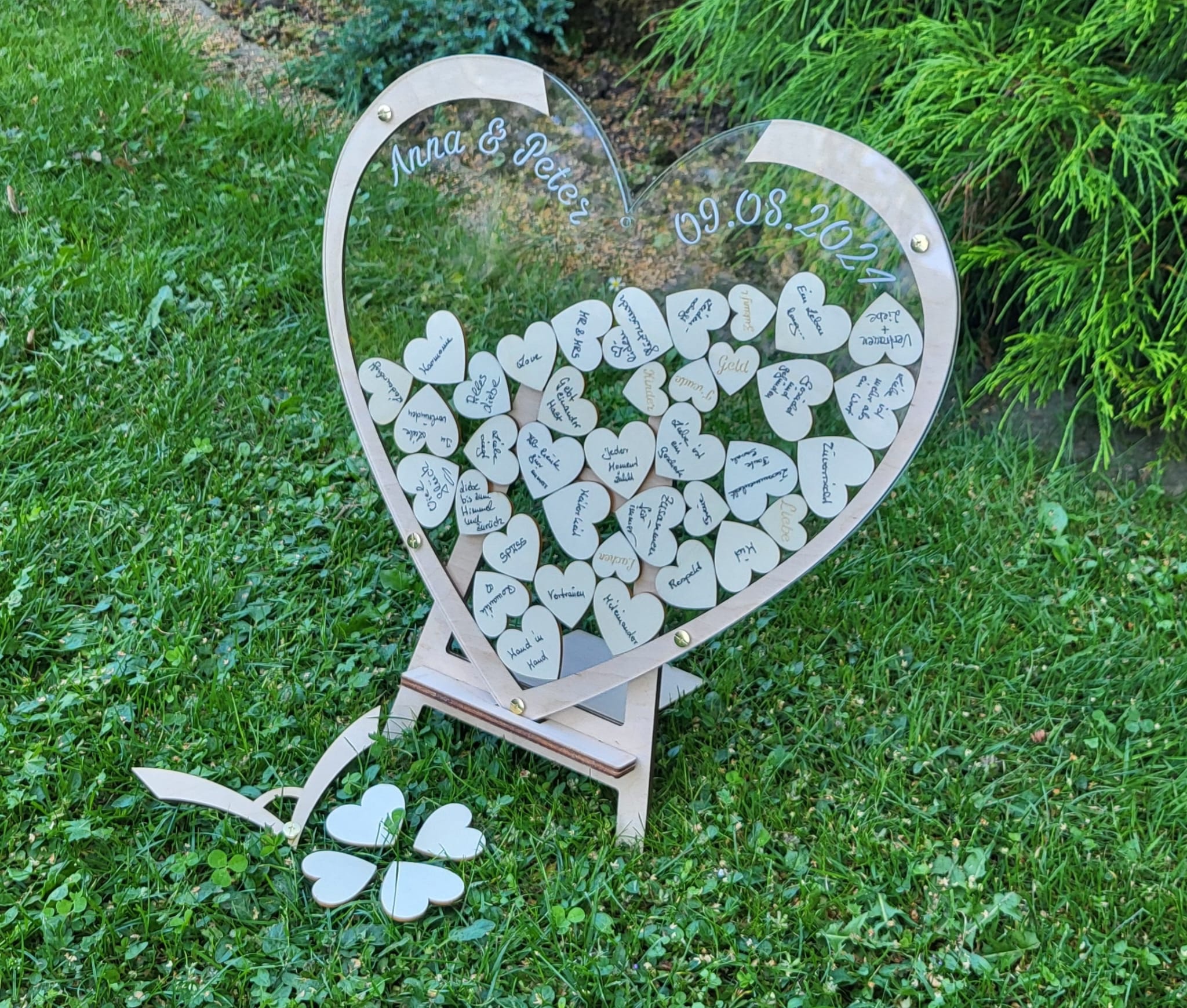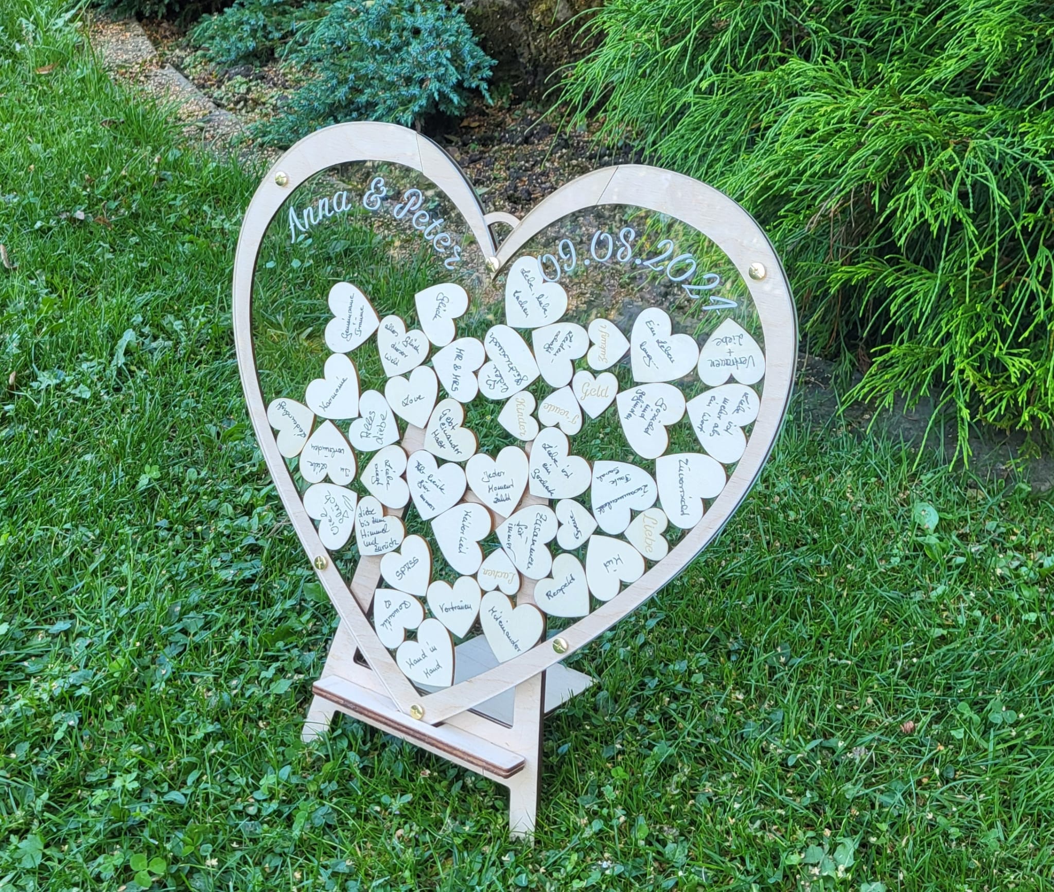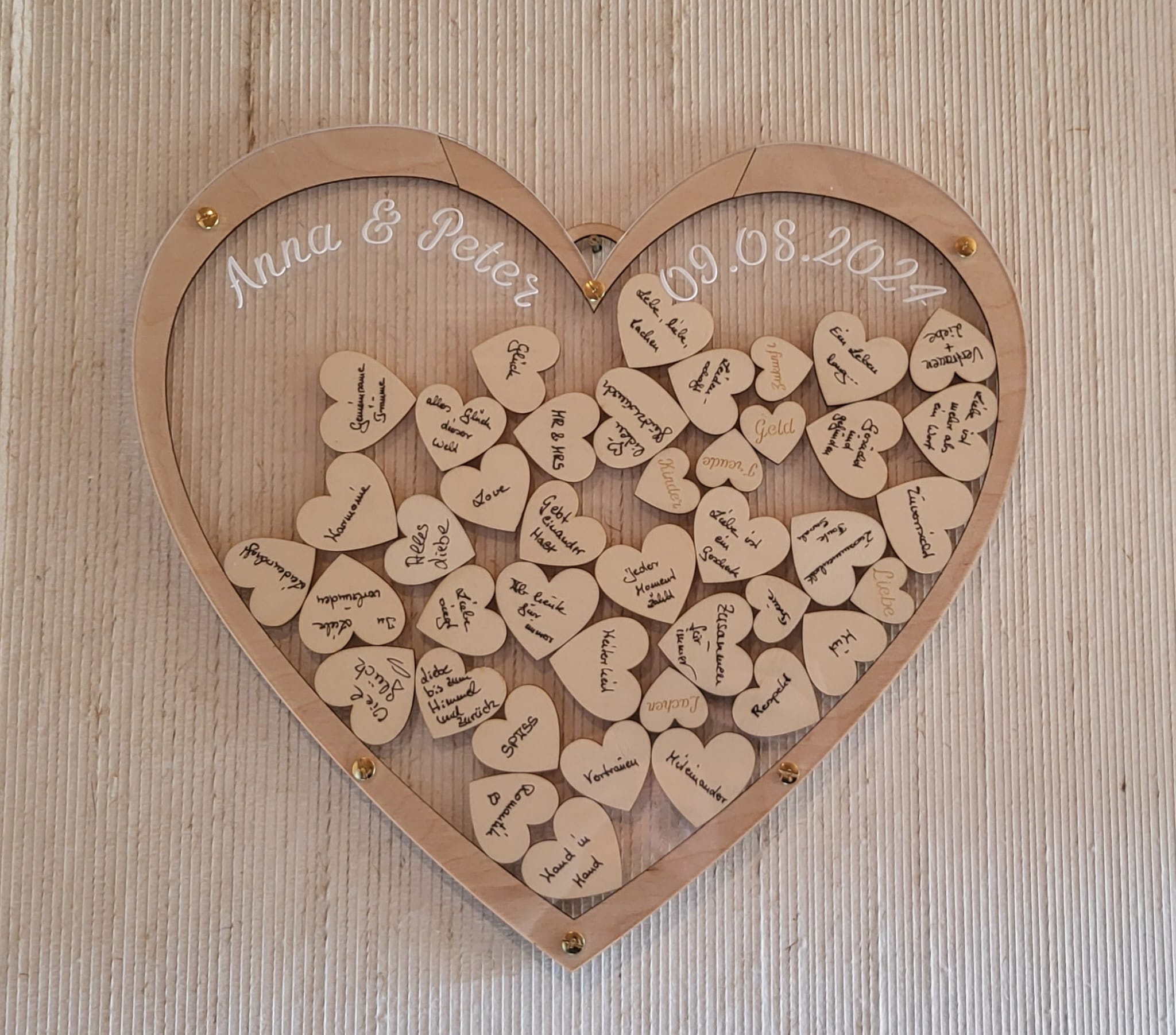 Durch eine Öffnung können kleine Holzherzchen mit guten Wünschen für das Hochzeitspaar in das Herz gesteckt werden. Die Öffnung hat einen Verschluss an dem das Herz später aufgehängt werden kann.