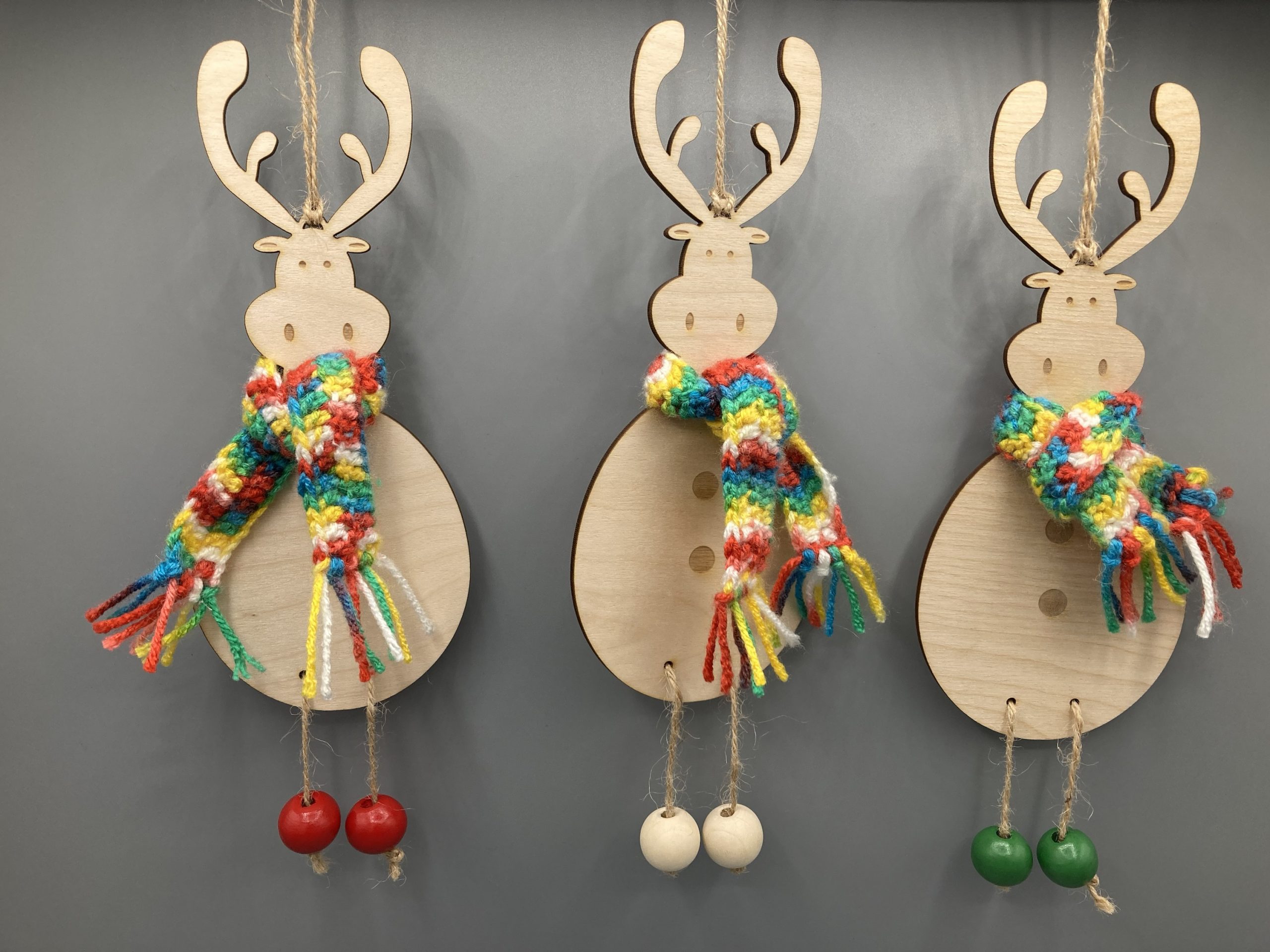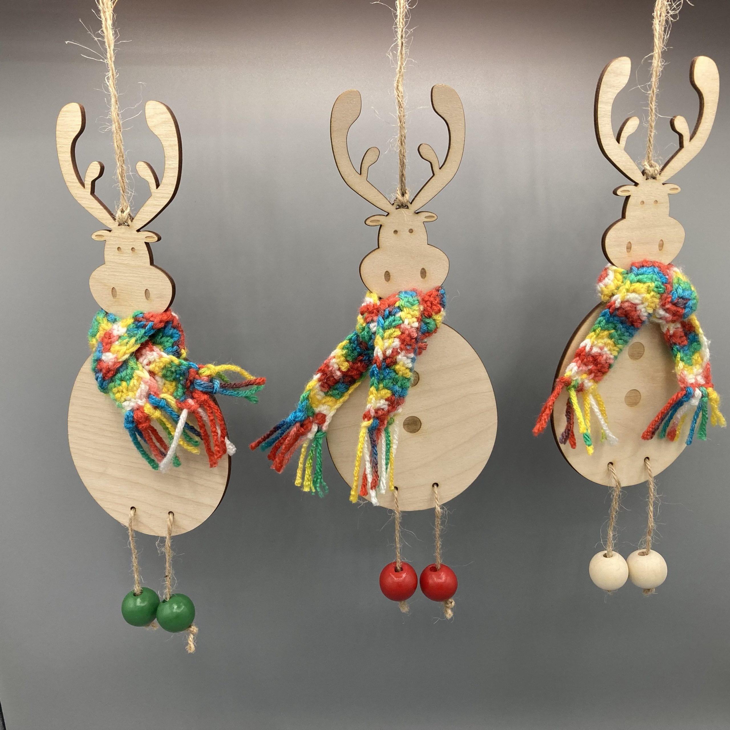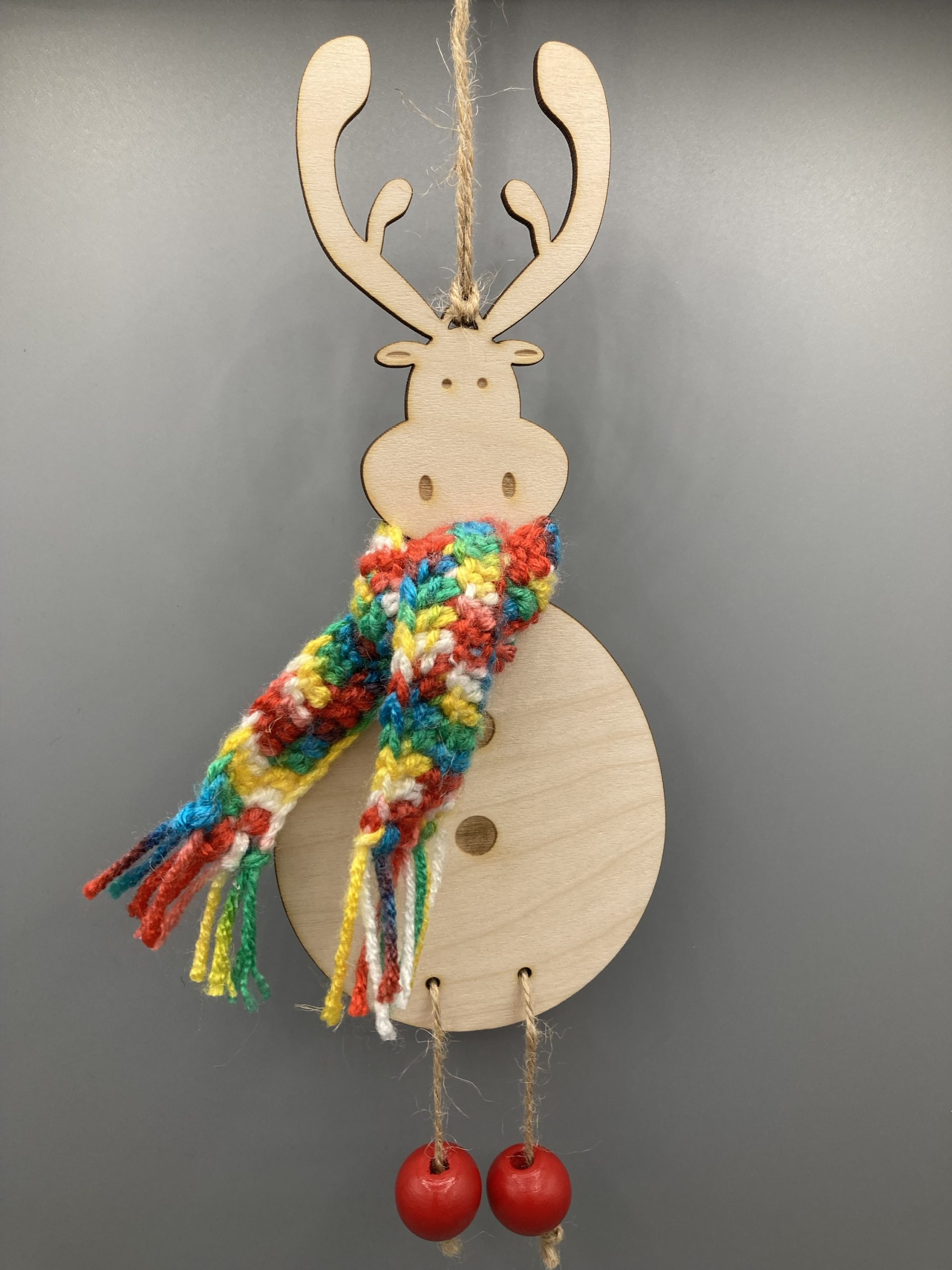 Elch aus Holz mit gehäkeltem Schal
